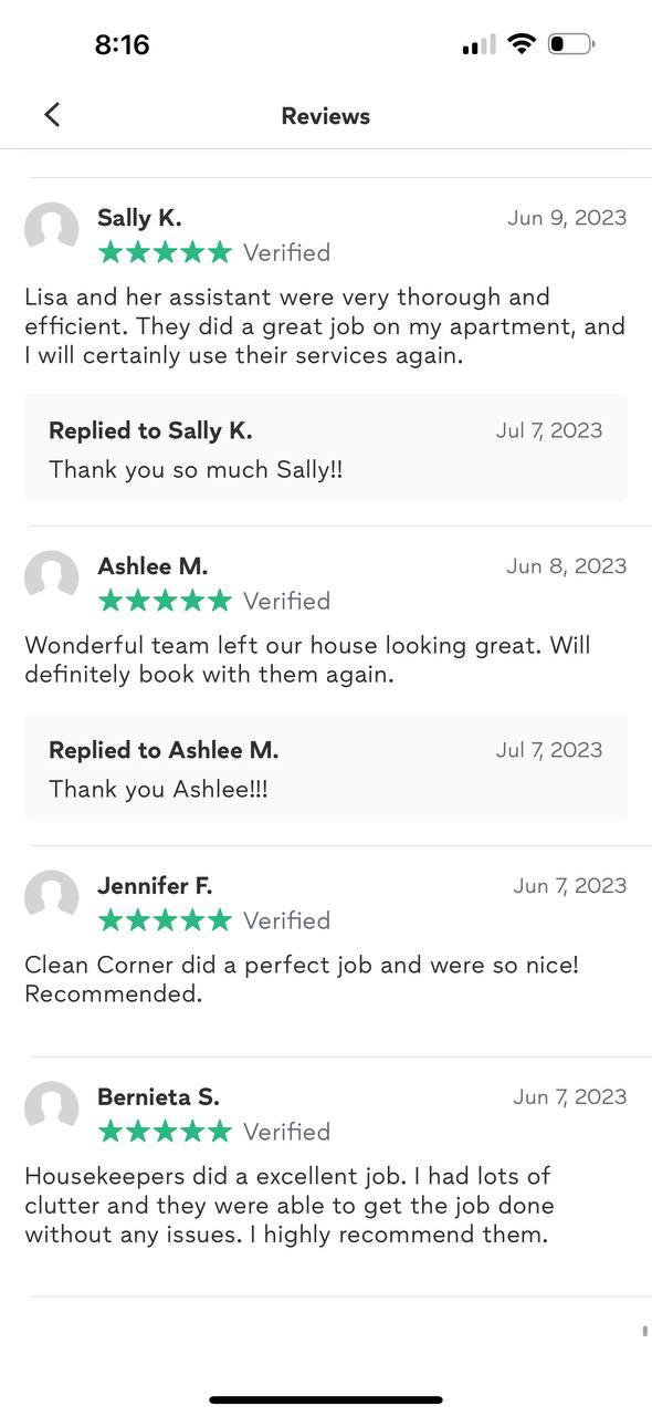 At Clean Corner, we take pride in delivering a positive and satisfying experience for our clients. Here’s what some of them have to say about their experience with us:
